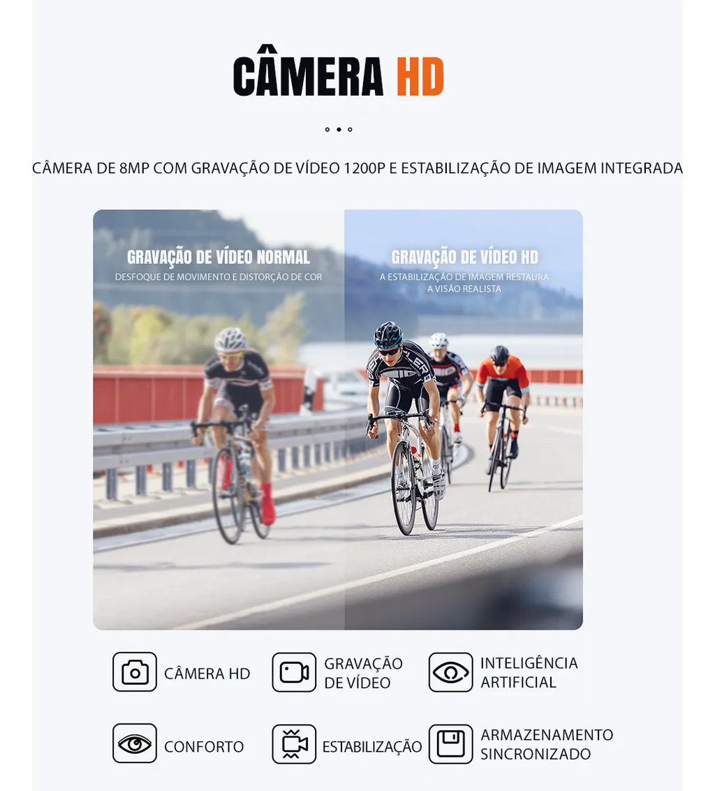 Capture cada quilômetro com a câmera integrada de alta definição, potencializada pela tecnologia AI Image Enhancement para otimização de imagem em tempo real. Enquanto grava seus trajetos, desfrute de uma experiência sonora imersiva com o sistema de áudio 360° (surround), que permite ouvir suas playlists e atender chamadas sem perder a percepção acústica do ambiente, garantindo segurança total no trânsito ou em trilhas.